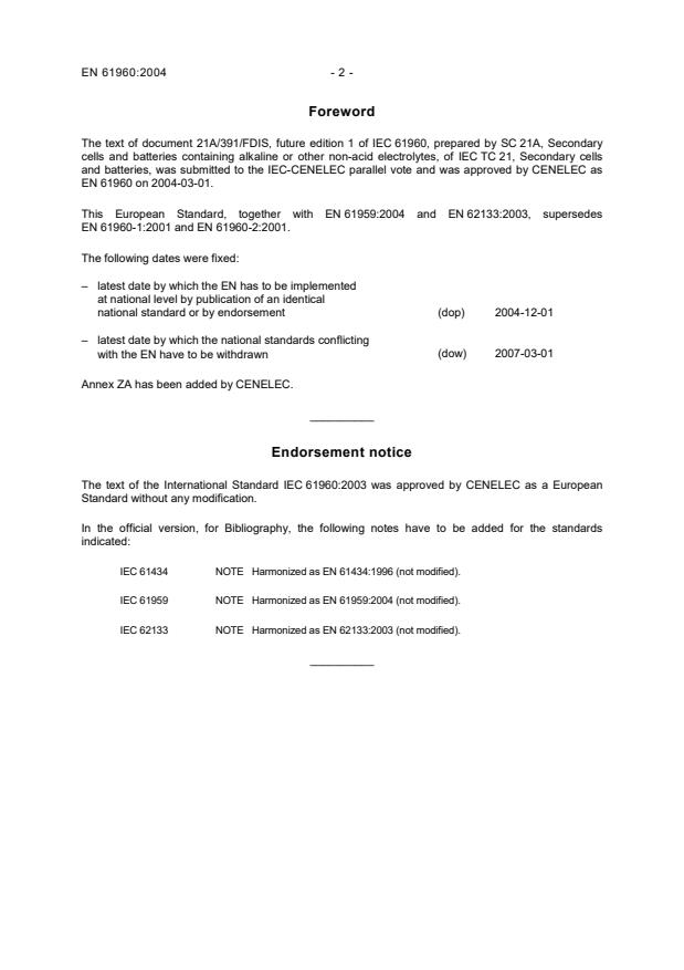 The text of the International Standard IEC 61960:2003 was approved by CENELEC as a European