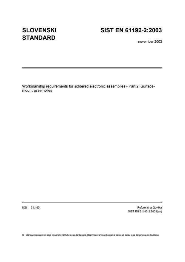 EN 61192-2:2003 is a standard published by CLC. Its full title is "Workmanship requirements for soldered electronic assemblies - Part 2: Surface-mount assemblies". This standard covers: Specifies requirements for workmanship in soldered surface-mounted electronic assemblies and multichip modules on organic substrates, on printed boards, and on similar laminates attached to the surface(s) of inorganic substrates. Applies to assemblies that are totally surface-mounted and to the surface-mount portions of assemblies that include other related assembly technologies, for example, through-hole mounting.