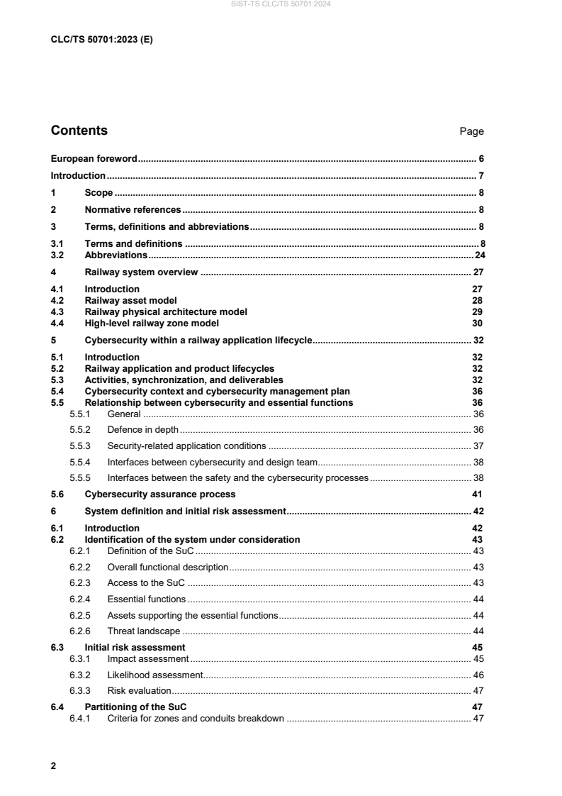 This document provides railway operators, system integrators and product suppliers, with guidance and specifications on how cybersecurity will be managed in the context of EN 50126 1 RAMS lifecycle process. This document aims at the implementation of a consistent approach to the management of the security of the railway systems. This document can also be applied to the security assurance of systems and components/equipment developed independently of EN 50126 1:2017. This document applies to Communications, Signalling and Processing domain, to Rolling Stock and to Fixed Installations domains. It provides references to models and concepts from which requirements and recommendations can be derived and that are suitable to ensure that the residual risk from security threats is identified, supervised and managed to an acceptable level by the railway system duty holder. It presents the underlying security assumptions in a structured manner. This document does not address functional safety requirements for railway systems but rather additional requirements arising from threats and related security vulnerabilities and for which specific measures and activities need to be taken and managed throughout the lifecycle. The aim of this document is to ensure that the RAMS characteristics of railway systems / subsystems / equipment cannot be reduced, lost or compromised in the case of cyber attacks. The security models, the concepts and the risk assessment process described in this document are based on or derived from the IEC/EN IEC 62443 series. This document is consistent with the application of security management requirements contained within IEC 62443 2 1, which in turn are based on EN ISO/IEC 27001 and EN ISO 27002.