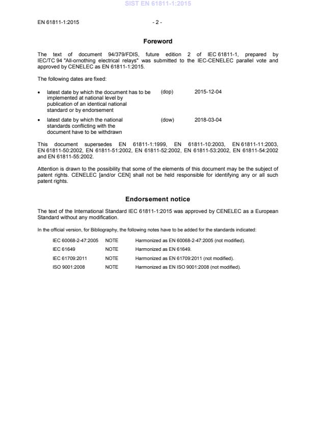 EN 61811-1:2015 (CLC adoption of IEC 61811-1:2015) is the generic specification for electromechanical telecom elementary relays of assessed quality. It consolidates and replaces earlier EN/IEC parts (EN 61811-1, -10, -11, -50 to -55) into a single technical revision. The standard selects appropriate test methods from the IEC 61810 series and other sources, provides basic test schedules, and supplies a blank detail specification format to be completed for particular relay types and applications.