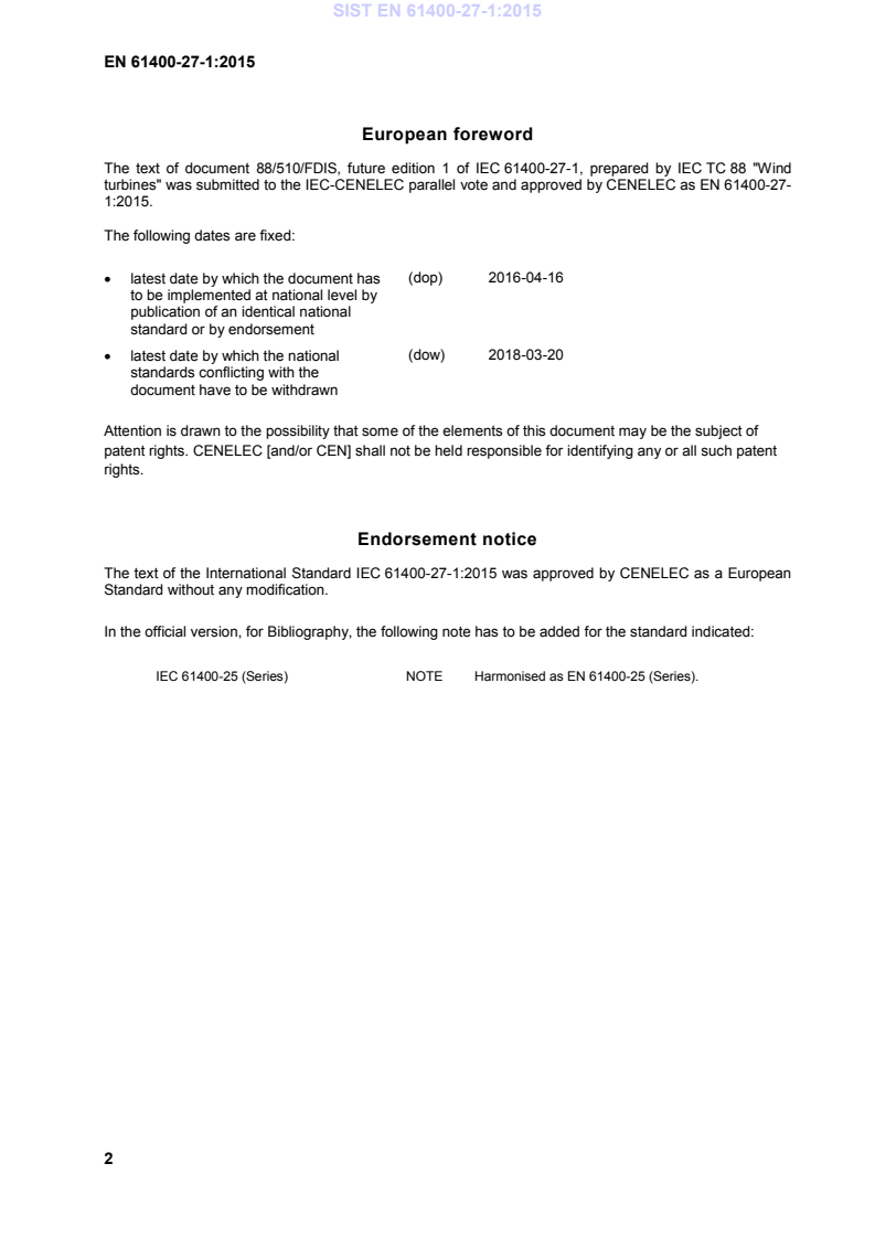 turbines" was submitted to the IEC-CENELEC parallel vote and approved by CENELEC as EN 61400-27-