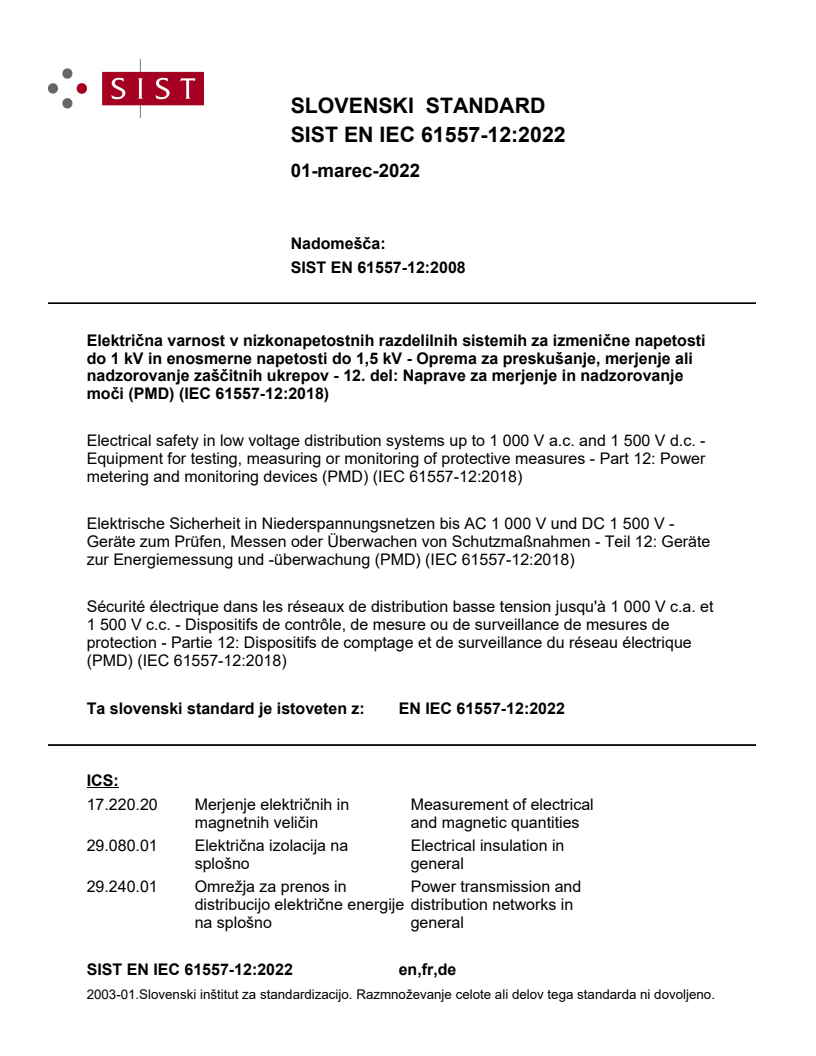 Električna varnost v nizkonapetostnih razdelilnih sistemih za izmenične napetosti do 1 kV in enosmerne napetosti do 1,5 kV - Oprema za preskušanje, merjenje ali nadzorovanje zaščitnih ukrepov - 12. del: Naprave za merjenje in nadzorovanje moči (PMD) (IEC 61557-12:2018)