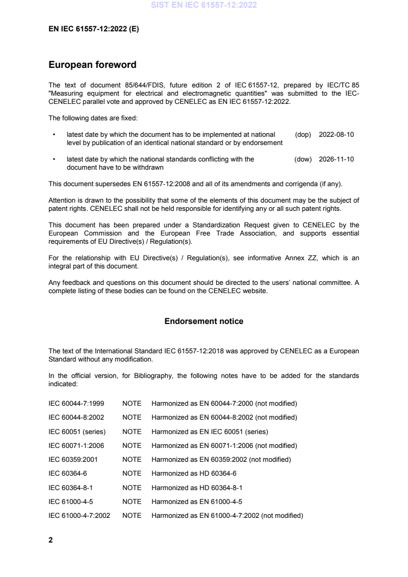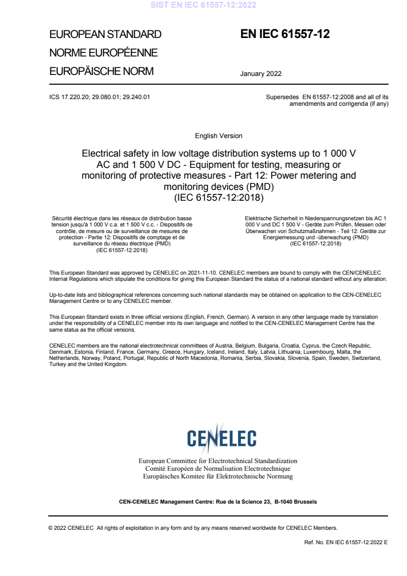 EN IEC 61557-12:2022 is a standard published by CLC. Its full title is "Electrical safety in low voltage distribution systems up to 1 000 V AC and 1 500 V DC - Equipment for testing, measuring or monitoring of protective measures - Part 12: Power metering and monitoring devices (PMD)". This standard covers: IEC 61557-12:2018 is available as IEC 61557-12:2018 RLV which contains the International Standard and its Redline version, showing all changes of the technical content compared to the previous edition.IEC 61557-12:2018 specifies requirements for power metering and monitoring devices (PMD) that measure and monitor the electrical quantities within electrical distribution systems, and optionally other external signals. These requirements also define the performance in single- and three-phase AC or DC systems having rated voltages up to 1 000 V AC or up to 1 500 V DC. These devices are fixed or portable. They are intended to be used indoors and/or outdoors. Power metering and monitoring devices (PMD), as defined in this document, give additional safety information, which aids the verification of the installation and enhances the performance of the distribution systems. The power metering and monitoring devices (PMD) for electrical parameters described in this document are used for general industrial and commercial applications. This document does not address functional safety and cyber security aspects. This document is not applicable for: – electricity metering equipment that complies with IEC 62053-21, IEC 62053-22, IEC 62053-23 and IEC 62053-24. Nevertheless, uncertainties defined in this document for active and reactive energy measurement are derived from those defined in IEC 62053 (all parts); – the measurement and monitoring of electrical parameters defined in IEC 61557-2 to IEC 61557-9 and IEC 61557-13 or in IEC 62020; – power quality instrument (PQI) according IEC 62586 (all parts); – devices covered by IEC 60051 (all parts) (direct acting analogue electrical measuring instrument). IEC 61557-12:2018 cancels and replaces the first edition published in 2007. This edition constitutes a technical revision. This edition includes the following significant technical changes with respect to the previous edition: a) PMD-A has been withdrawn due the fact these devices are now mainly covered by the IEC 62586 series of standards. b) Three categories of PMD have been created with a list of minimum required functions for each category. c) Added a new Annex A explaining the different applications linked to the relevant standards and devices, and another new Annex C about the power factor conventions.