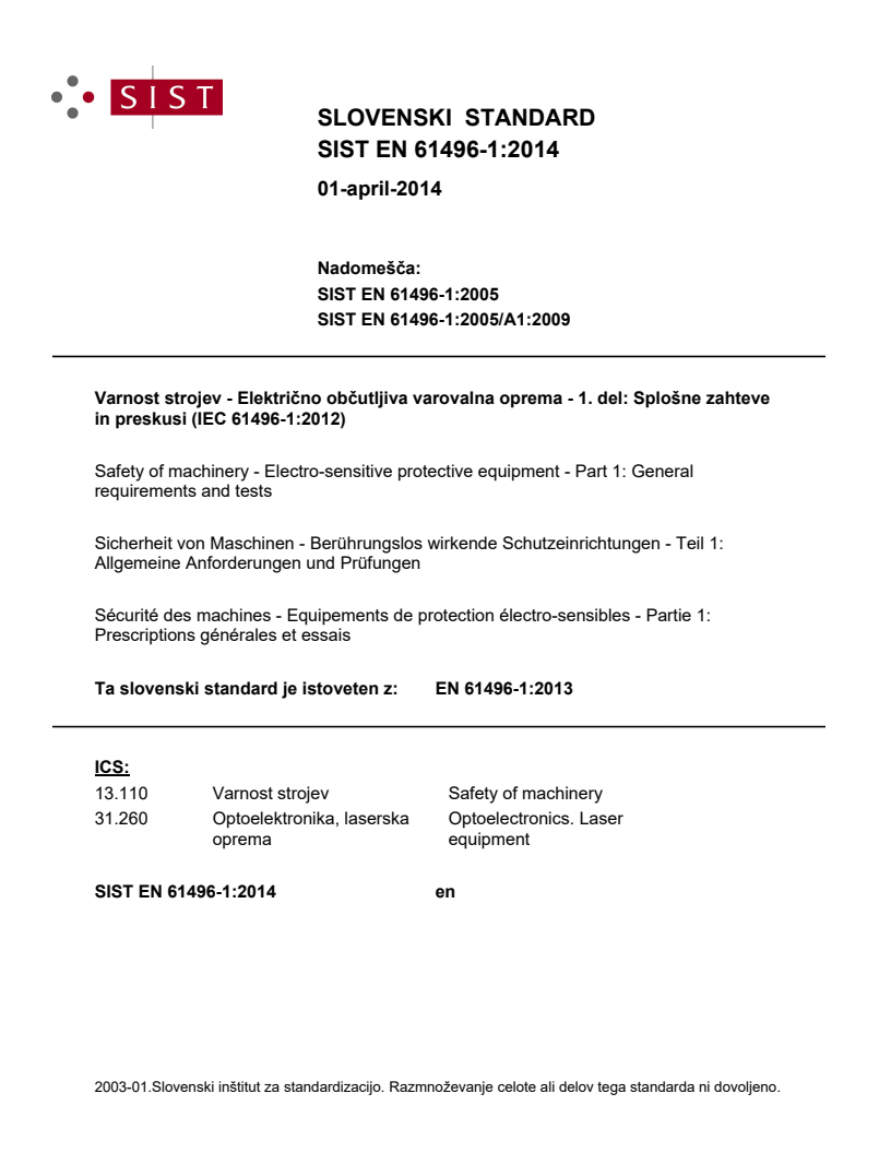 Ta slovenski standard je istoveten z: EN 61496-1:2013