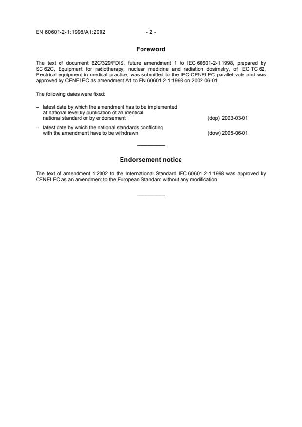 approved by CENELEC as amendment A1 to EN 60601-2-1:1998 on 2002-06-01.