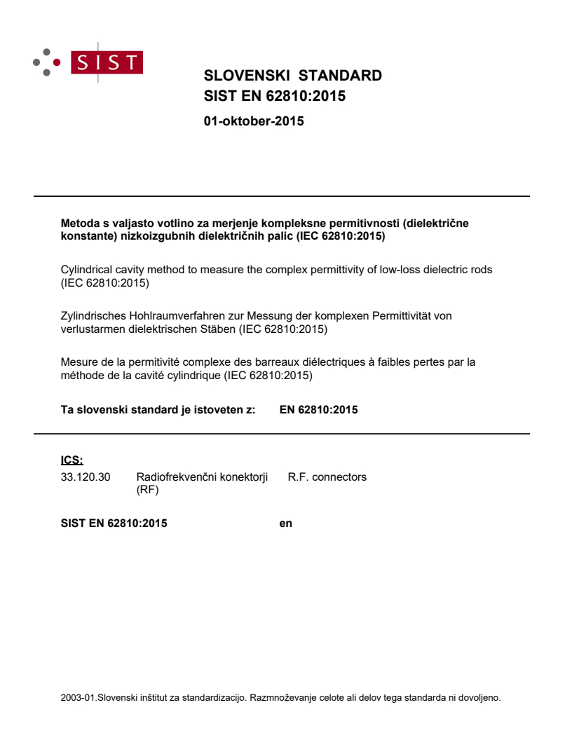 Keywords: EN 62810:2015, cylindrical cavity method, complex permittivity, low‑loss dielectric rods, TM010 mode, loss tangent, resonant cavity, dielectric measurement, microwave frequency.