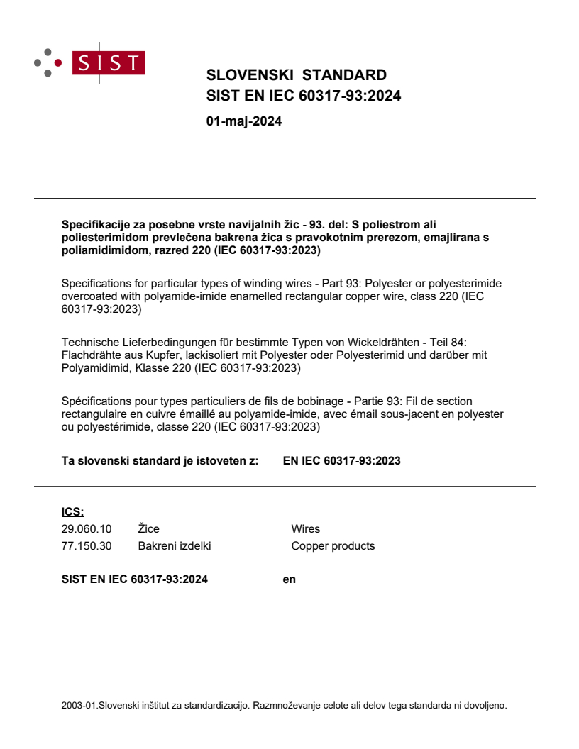 Specifikacije za posebne vrste navijalnih žic - 93. del: S poliestrom ali poliesterimidom prevlečena bakrena žica s pravokotnim prerezom, emajlirana s poliamidimidom, razred 220 (IEC 60317-93:2023)