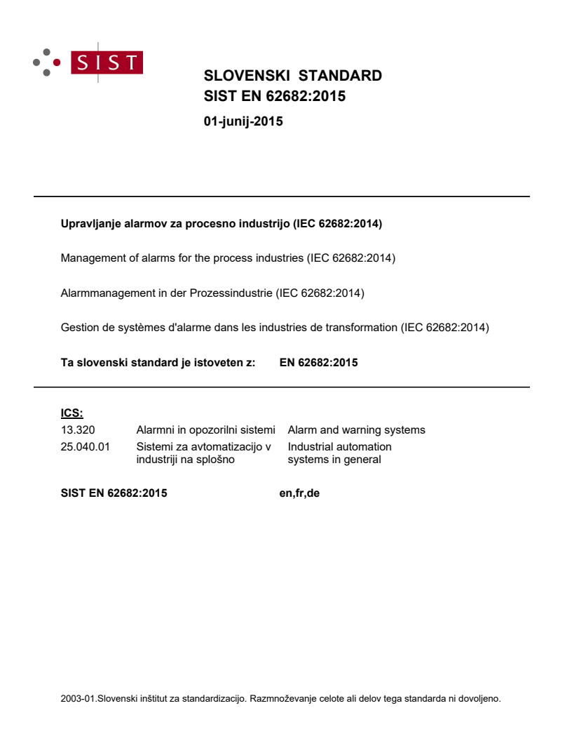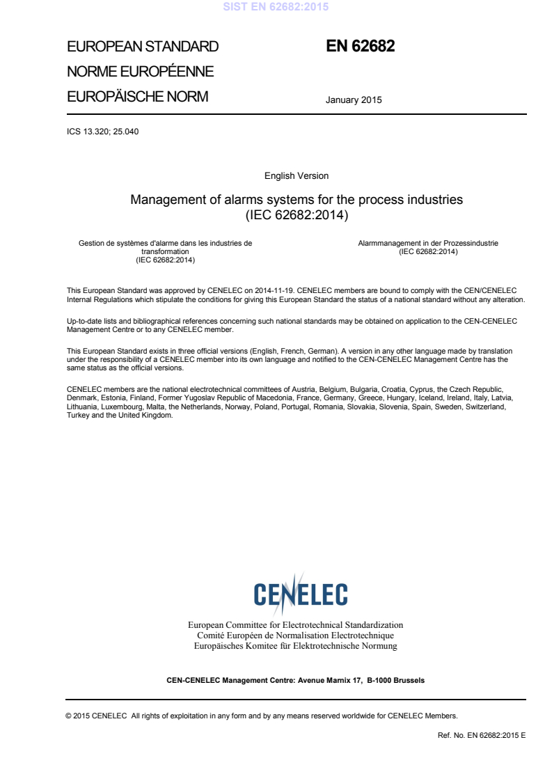 Keywords: EN 62682:2015, IEC 62682:2014, alarm management, alarm lifecycle, HMI design, alarm rationalization, process industries, safety instrumented systems, alarm philosophy.