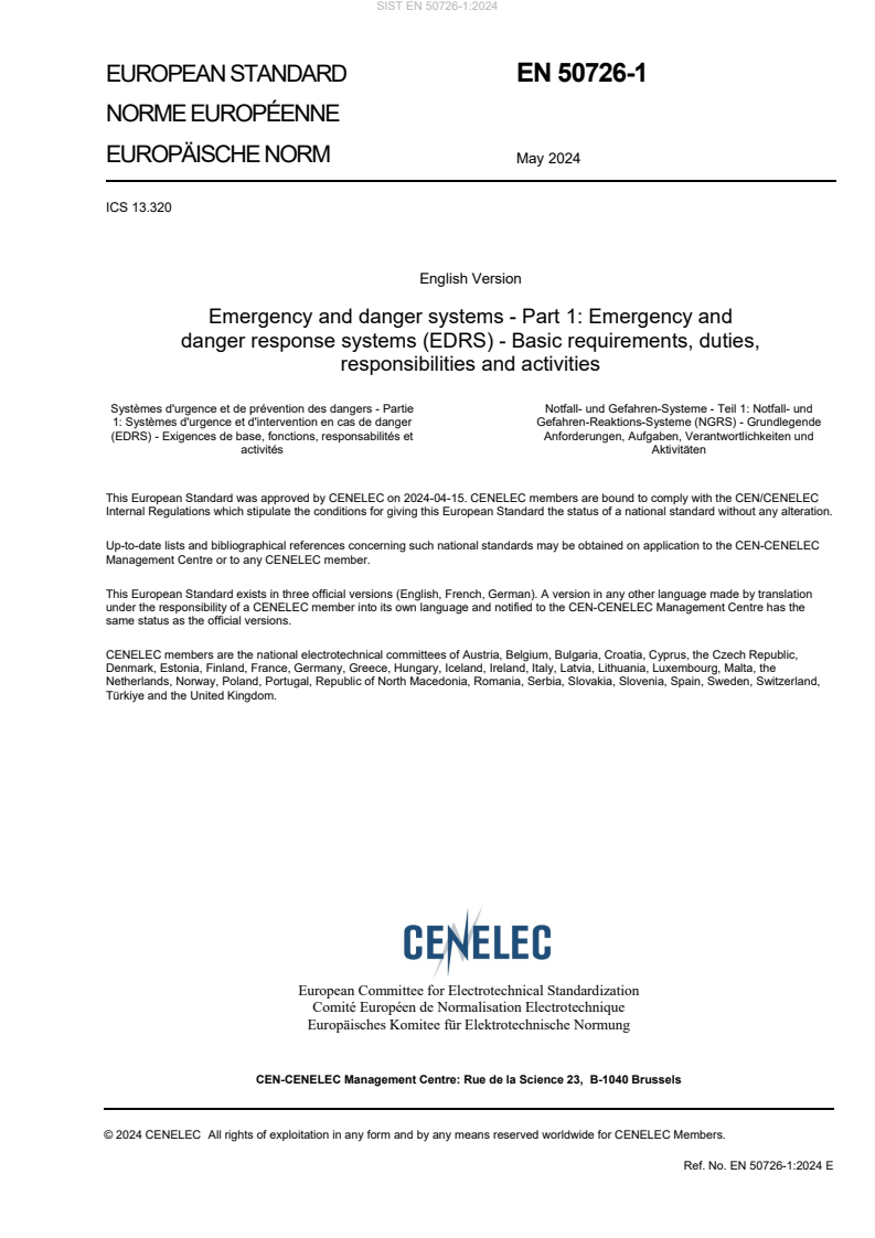 EN 50726-1:2024 is a standard published by CLC. Its full title is "Emergency and danger systems - Part 1: Emergency and danger response systems (EDRS) - Basic requirements, duties, responsibilities and activities". This standard covers: This document applies to the planning, installation, commissioning, operation and maintenance of an emergency and danger response system. An emergency and danger response system is part of an overall solution for dealing with specific events such as emergencies or crises. This document - specifies: - technical processes and responsibilities for supporting all procedures from the registration of an event (emergency, danger) up to its final processing; - the technical risk management including the definition of safety/security goals and the workflow organization as well as the necessary specifications regarding a technical risk management file; - associated duties, responsibilities and activities as parts of an integrated overall risk management process to achieve the safety and security goals, effectiveness and efficiency as well as data and system safety/security; - three different grades of safety/security, with the respective product functionalities required to achieve them; - the basic requirements for emergency and danger response systems (EDRS) in public buildings such as education facilities (e.g. schools, universities), government facilities, kindergartens and similar facilities; - the responsibilities under applicable national law about Safety and Health at Work Laws and thus particularly addresses the responsibility of employers; - describes: - the process of establishing, maintaining and updating a risk management file in which, inter alia, the technical risks are listed and evaluated and the residual technical risks are defined, resulting in the grade and structure of the EDRS; - is intended to support the implementation of: - National legal and other provisions (e.g. Act on Equal Opportunities for People with Disabilities, Safety and Health at Work Laws, education laws); - gives relevant guidance on: - the organizational risk management; - does not replace the specifications of standards to the following systems: - fire safety systems including, but not limited to, fire detection and fire alarm systems, fixed firefighting systems, smoke and heat control systems, - security systems including, but not limited to, intrusion and hold-up alarm systems, electronic access control systems, external perimeter security systems and video surveillance systems, - applicable national standards on call systems. All such systems can, however, be integrated into an emergency and danger response system (EDRS), taking into account the relevant provisions made in the respective standards for such products and systems. Other products and systems from the entire field of standardization, such as alarm systems, danger warning and danger alarm systems, escape routing systems, public address systems used to respond to a danger, can also be used in or integrated into an emergency and danger response system if the relevant requirements of the standards for such products or systems are met. This document does not specify any risk levels, in particular no acceptable residual risks. Technical risk management and organizational risk management are equal parts of the overall risk management. This document is also applicable to non-public buildings with a similar risk and requirement for protection.