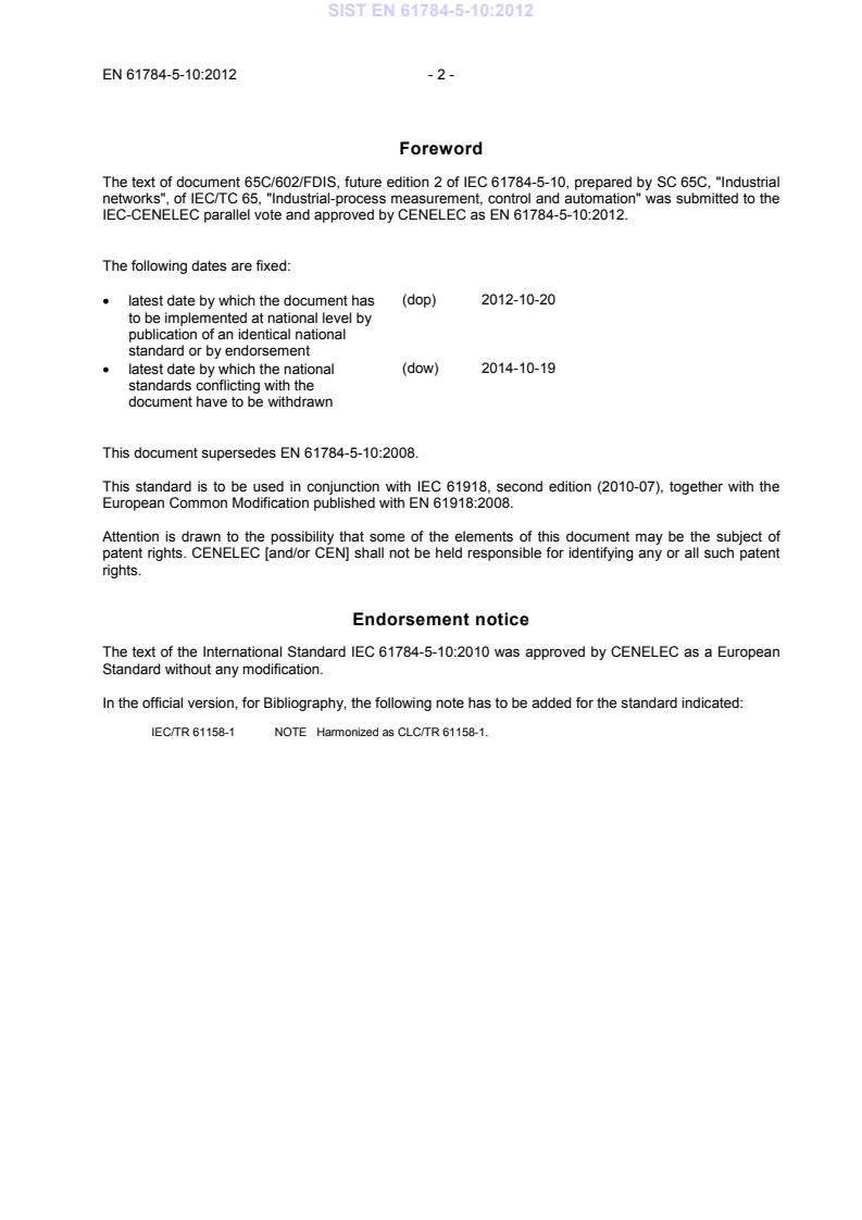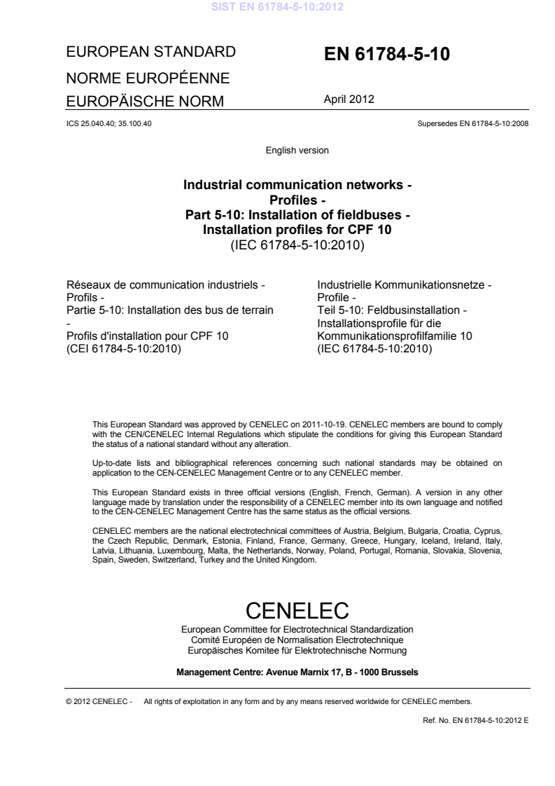 - Second edition is an editorial revision of the 2007 edition; no technical changes were introduced. Published by CENELEC/CLC as EN 61784-5-10:2012.