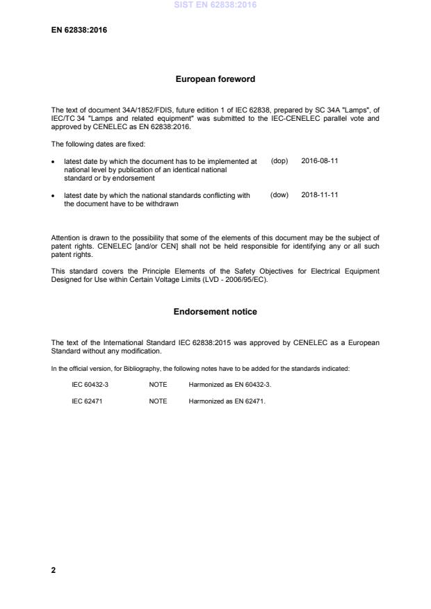 EN 62838:2016 is aligned with and references other IEC/CENELEC documents relevant to LED product safety and testing, such as IEC 61347‑1, IEC 62031, IEC 62560 and IEC 62471 for photobiological assessment. Use these cross‑references when applying EN 62838:2016 in conformity assessments or product design.