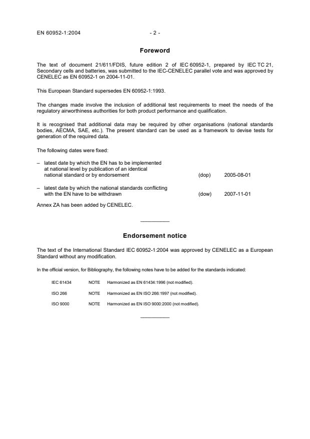 EN 60952-1:2004 is a standard published by CLC. Its full title is "Aircraft batteries - Part 1: General test requirements and performance levels". This standard covers: This part of EN 60952 defines test procedures for the evaluation, comparison and qualification of batteries and states minimum environmental performance levels for airworthiness. Where specific tests are defined with no pass/fail requirement (to establish performance capability), the manufacturer's declared values, from qualification testing, will be used to establish minimum requirements for ongoing maintenance of approval for that design of battery.