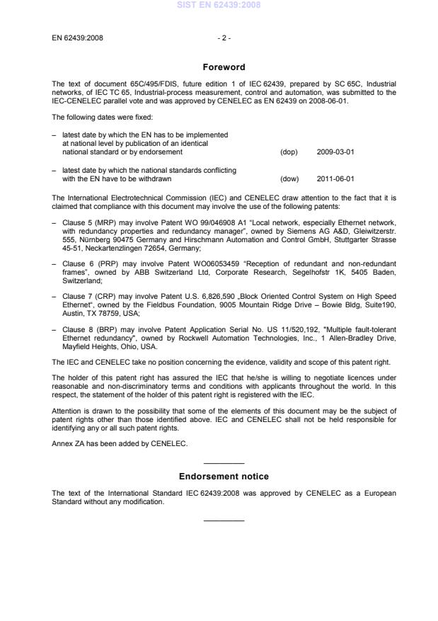 Attention is drawn to the possibility that some of the elements of this document may be the subject of patent rights other than those identified above. IEC shall not be held responsible for identifying any or all such patent rights.” IEC 62439 has been prepared by subcommittee 65C: Industrial networks, of IEC technical committee 65: Industrial-process measurement and control. SIST EN 62439:2008