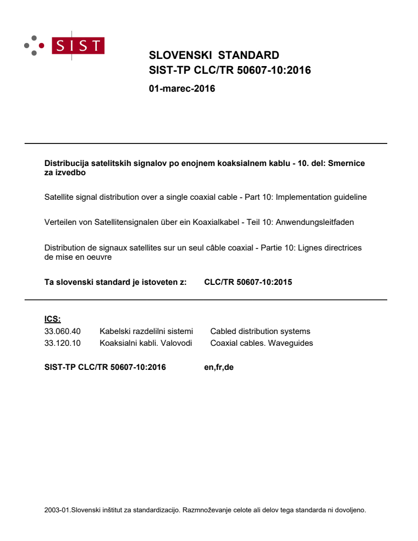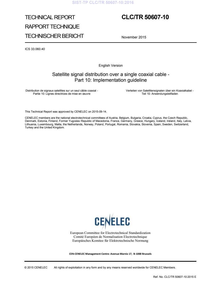 CLC/TR 50607-10:2015 is a technical report published by CLC. Its full title is "Satellite signal distribution over a single coaxial cable - Part 10: Implementation guideline". This standard covers: This Technical Report describes a number of different satellite reception scenarios and how to use SCD2 here. In particular, Universal and Wideband LNB architectures for different SHF bands (Ku-, Ka- and C Band) are taken into account.