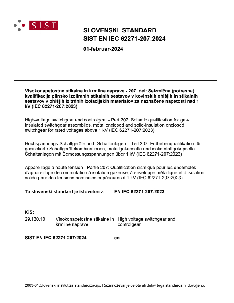 Visokonapetostne stikalne in krmilne naprave - 207. del: Seizmična (potresna) kvalifikacija plinsko izoliranih stikalnih sestavov v kovinskih ohišjih in stikalnih sestavov v ohišjih iz trdnih izolacijskih materialov za naznačene napetosti nad 1 kV (IEC 62271-207:2023)