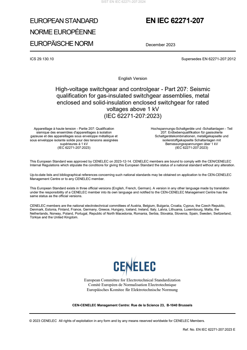EN IEC 62271-207:2023 (CLC adoption of IEC 62271-207:2023) specifies seismic qualification requirements for high‑voltage and medium‑voltage switchgear and controlgear assemblies. The third edition expands the scope to cover gas‑insulated switchgear (GIS), AC metal‑enclosed and AC solid‑insulation enclosed switchgear for rated voltages above 1 kV, and DC GIS at and above 100 kV. It replaces earlier editions and harmonises seismic qualification procedures with IEEE Std 693‑2018.