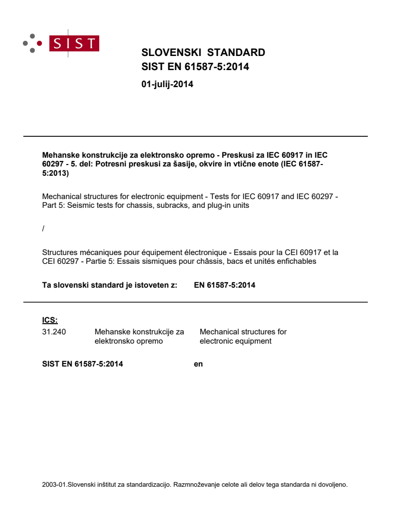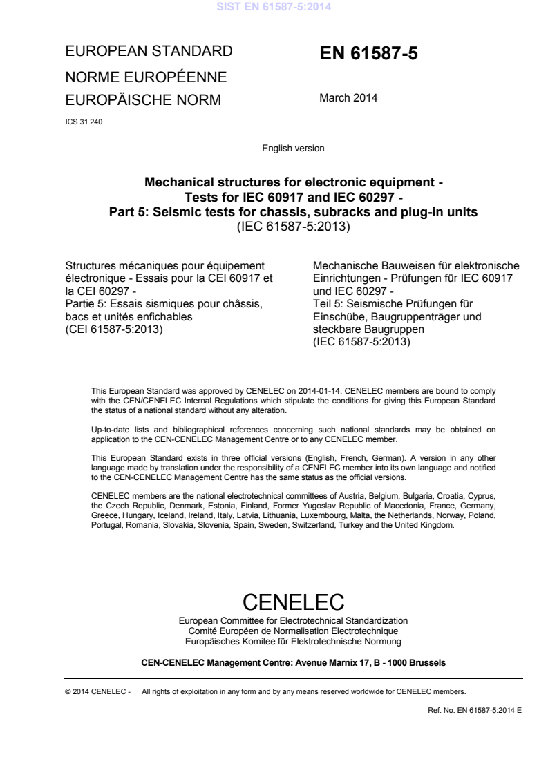 EN 61587-5:2014 - Seismic tests for chassis, subracks and plug-in units (CLC adoption)