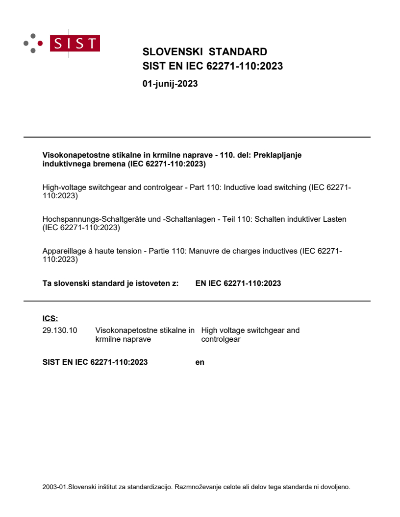 Visokonapetostne stikalne in krmilne naprave - 110. del: Preklapljanje induktivnega bremena (IEC 62271-110:2023)