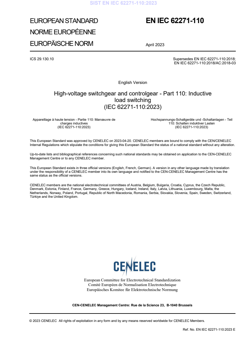 EN IEC 62271-110:2023 is the fifth-edition international standard for high-voltage switchgear and controlgear focused on inductive load switching. It applies to AC switching devices for indoor or outdoor installation, operating at 50 Hz or 60 Hz on systems above 1 000 V. The publication is available as the International Standard together with a Redline (RLV) version that shows all technical changes compared to the previous edition. This edition supersedes EN IEC 62271-110:2018 and updates references to the latest editions of IEC 62271-100 and IEC 62271-106.