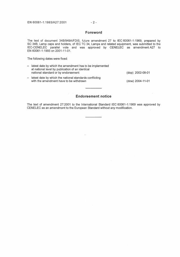 and safety – Part 1: Lamp caps - Amendment A27 (IEC 60061-1:1969/A27:2001)