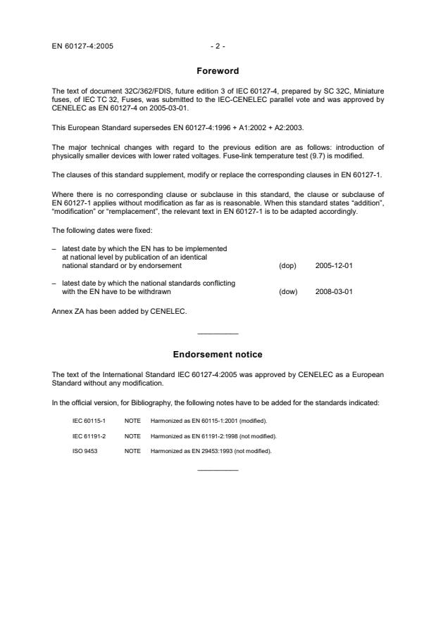 EN 60127-4:2005 has the following relationships with other standards: It is inter standard links to EN 60127-4:1996, EN 60127-4:1996/A2:2003, EN 60127-4:1996/A1:2002, EN 60127-4:2005/A2:2013, EN 60127-4:2005/A1:2009, FprEN IEC 60127-4:2025. Understanding these relationships helps ensure you are using the most current and applicable version of the standard.