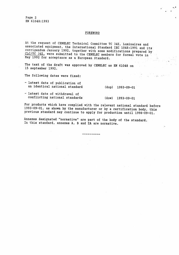 EN 61048:1993 is a standard published by CLC. Its full title is "Auxiliaries for lamps - Capacitors for use in tubular fluorescent and other discharge lamp circuits - General and safety requirements". This standard covers: Specifies the requirements for both self-healing and non-self-healing continuously rated a.c. capacitors of up to and including 2,5 kvar, and not less than 0,1 F, having a rated voltage not exceeding 1 000 V, which are intended for use in discharge lamp circuits operating at 50 Hz or 60 Hz and at altitudes up to 3 000 m. Does not cover radio-interference suppressor capacitors the requirements for which are given in IEC 60384-14.