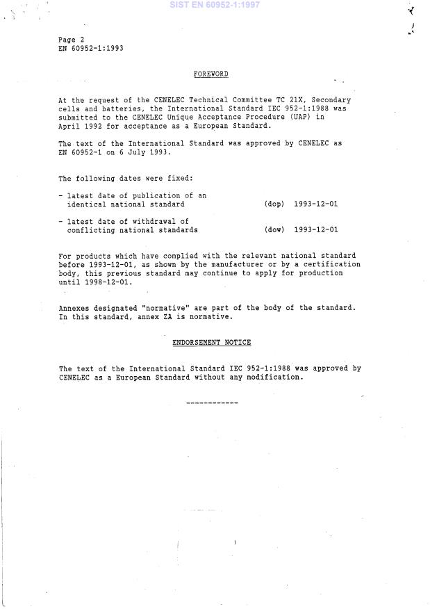 EN 60952-1:1993 is a standard published by CLC. Its full title is "Aircraft batteries - Part 1: General test requirements and performance levels". This standard covers: This standard, published in two parts, covers both vented nickel-cadmium and vented lead-acid aircraft batteries containing vented or valve-regulated cells or monoblocs. The batteries are used for general purposes and dedicated applications. Defines test procedures for the evaluation, comparison and qualification of batteries and to state minimum performance levels.