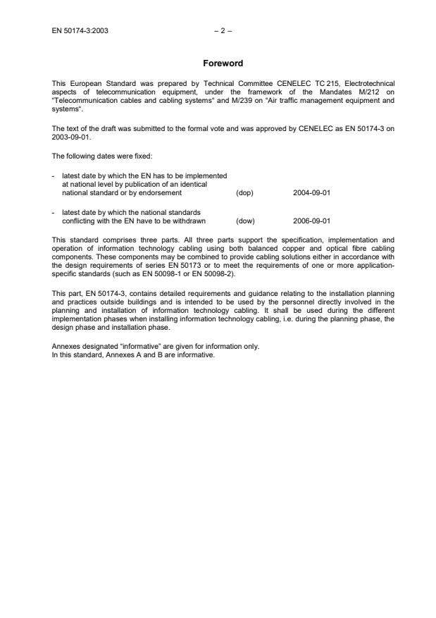 The text of the draft was submitted to the formal vote and was approved by CENELEC as EN 50174-3 on 2003-09-01. The following dates were fixed: - latest date by which the EN has to be implemented at national level by publication of an identical national standard or by endorsement