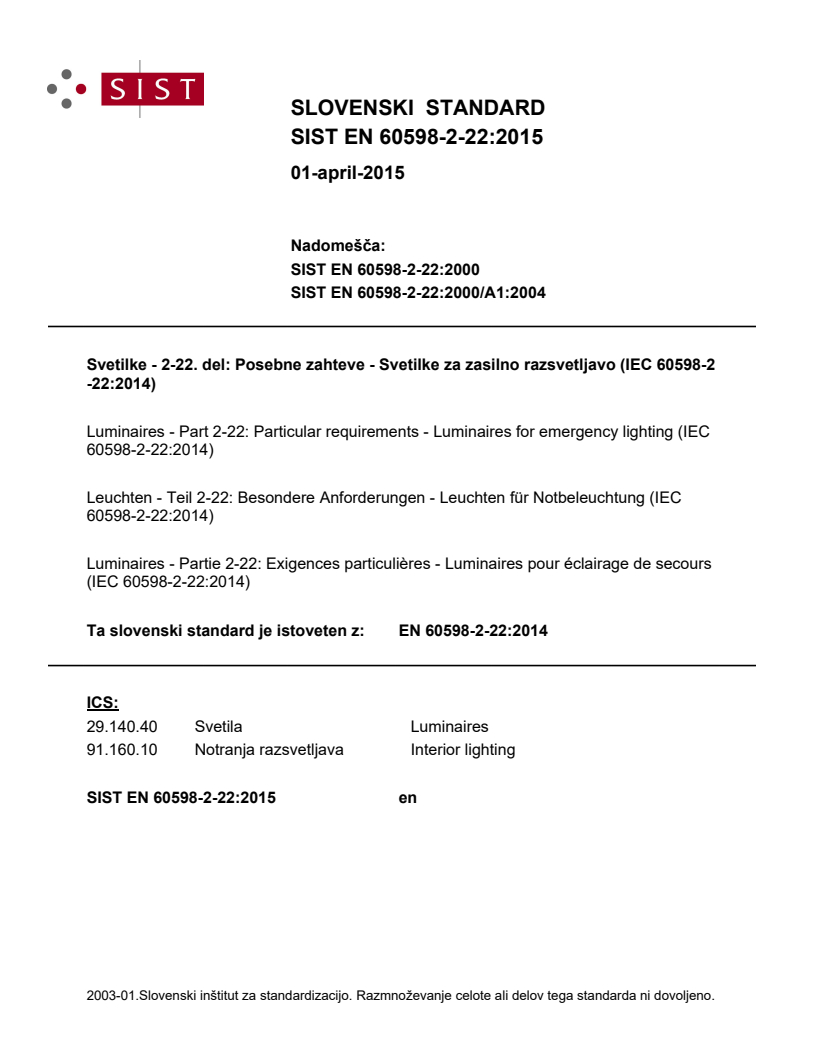 Ta slovenski standard je istoveten z: EN 60598-2-22:2014