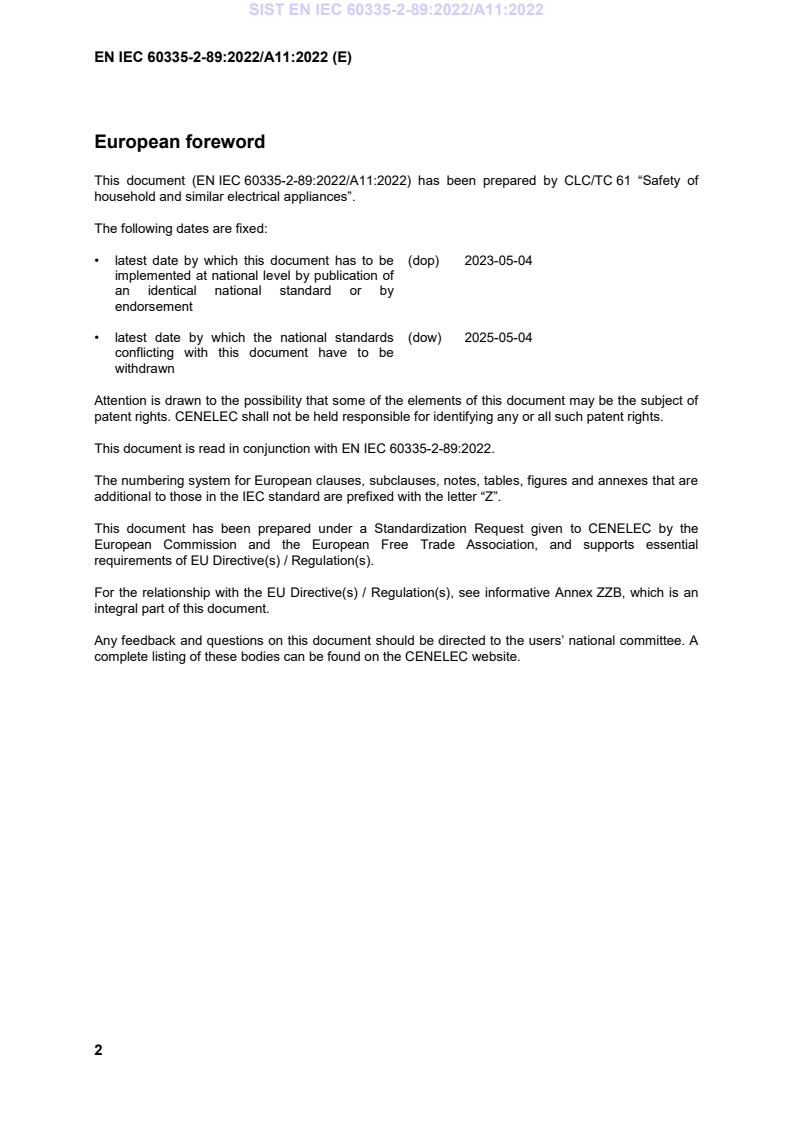This amendment A11 modifies the European Standard EN IEC 60335-2-89:2022; it was approved by CENELEC on 2022-05-04. CENELEC