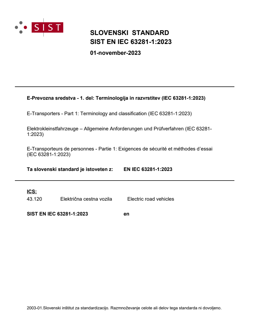 IEC 63281-1:2023 specifies the terminology and classification of e-Transporters. This document is applicable to "e-Transporters": electrically powered transport devices for use on public roads or in public spaces. These e-Transporters provide solutions for transporting either passengers or goods, or both. These devices can be manually controlled, have automated functions or be autonomous.