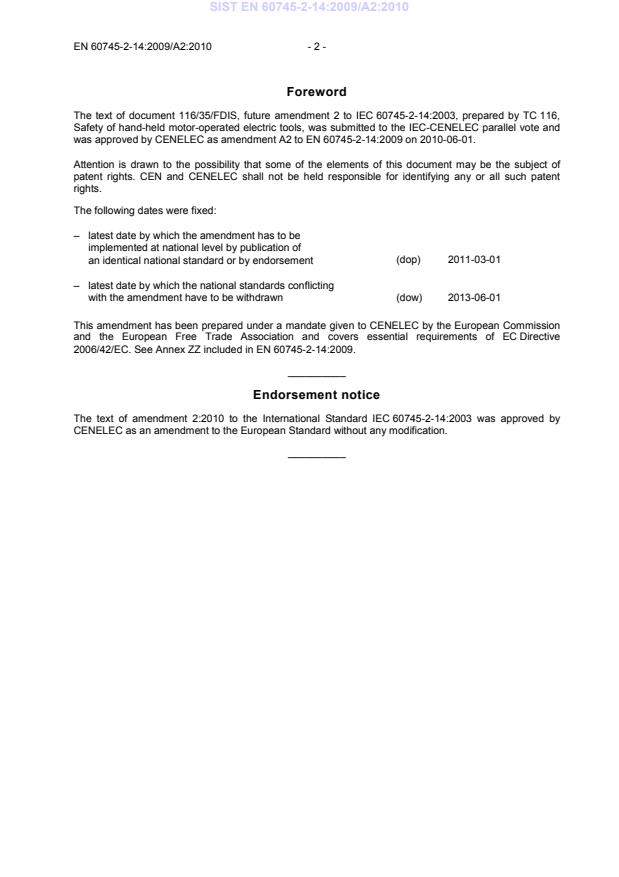 This amendment A2 modifies the European Standard EN 60745-2-14:2009; it was approved by CENELEC on