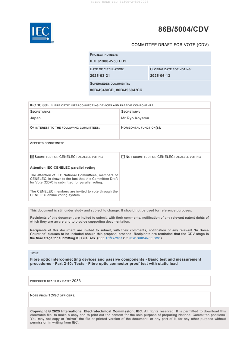 IEC CDV 61300-2-50 IEC 2025 3 86B/5004/CDV