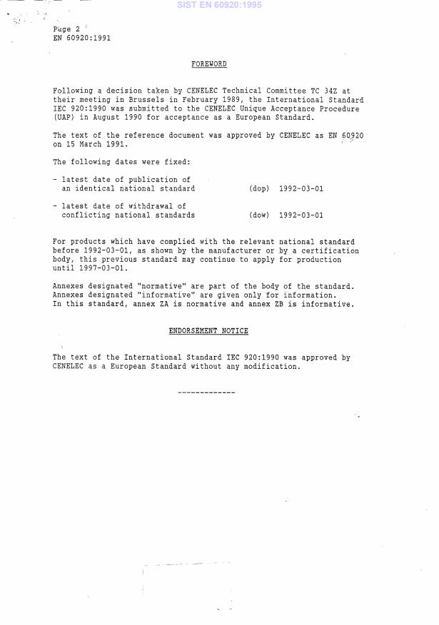 EN 60920:1991/A1:1993 is associated with the following European legislation: EU Directives/Regulations: 2006/95/EC, 73/23/EEC. When a standard is cited in the Official Journal of the European Union, products manufactured in conformity with it benefit from a presumption of conformity with the essential requirements of the corresponding EU directive or regulation.