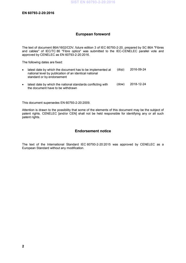 This document supersedes EN 60793-2-20:2009. Attention is drawn to the possibility that some of the elements of this document may be the subject of patent rights. CENELEC [and/or CEN] shall not be held responsible for identifying any or all such patent rights. Endorsement notice The text of the International Standard IEC 60793-2-20:2015 was approved by CENELEC as a European Standard without any modification. SIST EN 60793-2-20:2016