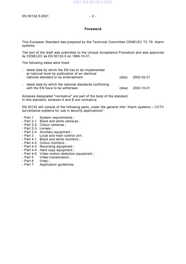 EN 50132-5:2001 is a standard published by CLC. Its full title is "Alarm systems - CCTV surveillance systems for use in security applications - Part 5: Video transmission". This standard covers: This standard specifies the minimum requirements for the specification and testing of the performance of a video transmission channel involving transmitter, receiver or intermediate devices associated with the selected transmission media, for use in CCTV surveillance systems. Video transmission equipment may be combined with additional functions, e.g. for audio or data transmission. These functions are not included in this standard. This standard covers the transmission of colour and black and white video signals in accordance with CCIR Report 624-4, 625 lines, 50 fields per second. This standard is not applicable for transmission systems which use in the whole system or in parts thereof compressed video signals in any way. NOTE Compression techniques use methods to match the information content of signals to the best channel capacity. The various test signals of this standard applied on different methods to compress video signals can supply results which meet the requirements of this standard. However, it should not be concluded from such results that those parts of transmission systems using methods to compress video signals are able to transmit a real video signal with a high information content in the correct way. Methods to compress video signals can use techniques reducing video signals without any loss of information (so called “redundant reduction”) or with some loss of information (so called “irrelevance reduction”).