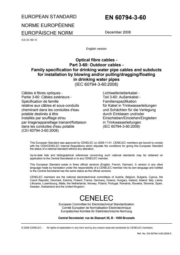 EN 60794-3-60:2008 is a standard published by CLC. Its full title is "Optical fibre cables - Part 3-60: Outdoor cables - Family specification for drinking water pipe cables and subducts for installation by blowing and/or pulling/dragging/floating in drinking water pipes". This standard covers: IEC 60794-3-60:2008(E) is part of the IEC 60794 family specifications that covers drinking water pipe cables and subducts for installation by blowing and/or pulling/dragging/floating in drinking water pipes. Systems built with components covered by this standard are subject to the requirements of sectional specification IEC 60794-3. This standard is to be used in conjunction with IEC 60794-1-1, IEC 60794-1-2 and IEC 60794-3.
