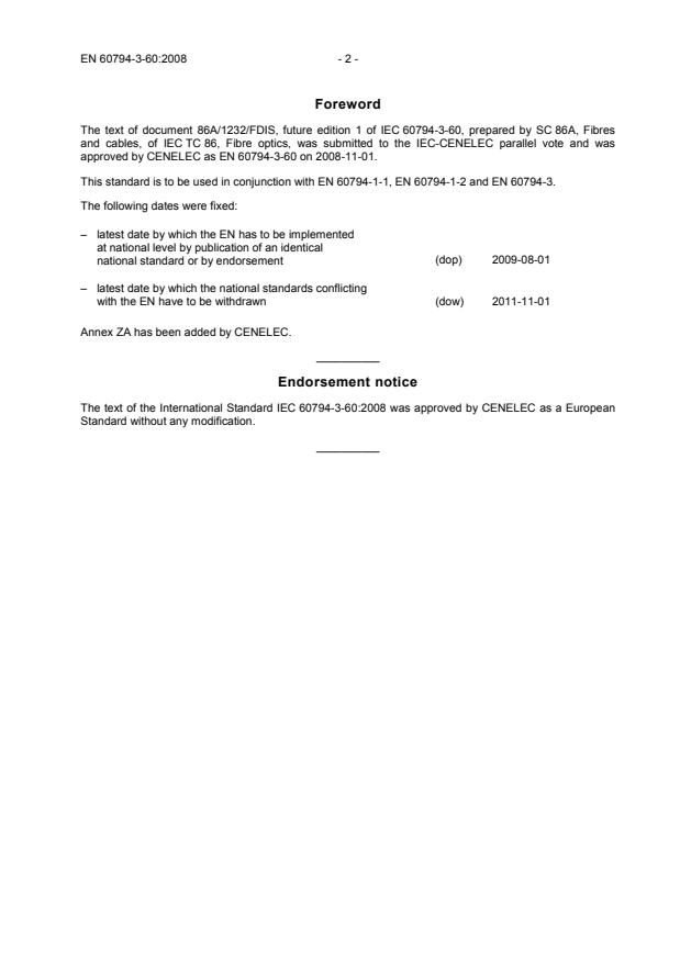 2011-11-01 Annex ZA has been added by CENELEC. __________ Endorsement notice The text of the International Standard IEC 60794-3-60:2008 was approved by CENELEC as a European Standard without any modification. __________