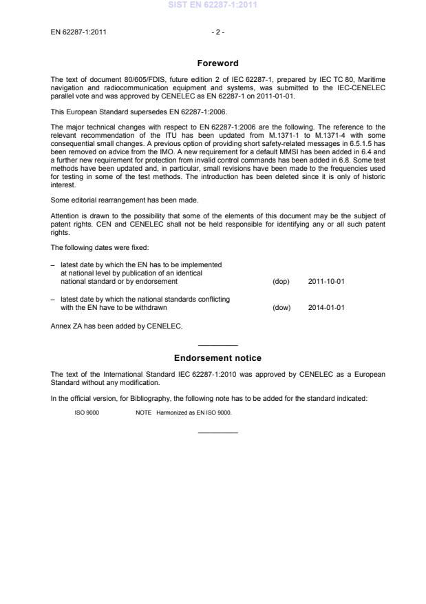 EN 62287-1:2011 is a standard published by CLC. Its full title is "Maritime navigation and radiocommunication equipment and systems - Class B shipborne equipment of the automatic identification system (AIS) - Part 1: Carrier-sense time division multiple access (CSTDMA) techniques". This standard covers: IEC 62287-1:2010(E) specifies the minimum operational and performance requirements, methods of testing and required test results for Class B shipborne AIS equipment using CSTDMA techniques. This standard takes into account other associated IEC International Standards and existing national standards, as applicable. It is applicable for AIS equipment used on craft that are not covered by the mandatory carriage requirement of AIS under SOLAS Chapter V. The major technical changes with respect to the first edition are the following. The reference to the relevant recommendation of the ITU has been updated from M.1371-1 to M.1371-4 with some consequential small changes. A previous option of providing short safety-related messages in 6.5.1.5 has been removed on advice from the IMO. A new requirement for a default MMSI has been added in 6.4 and a further new requirement for protection from invalid control commands has been added in 6.8. Some test methods have been updated and, in particular, small revisions have been made to the frequencies used for testing in some of the test methods.