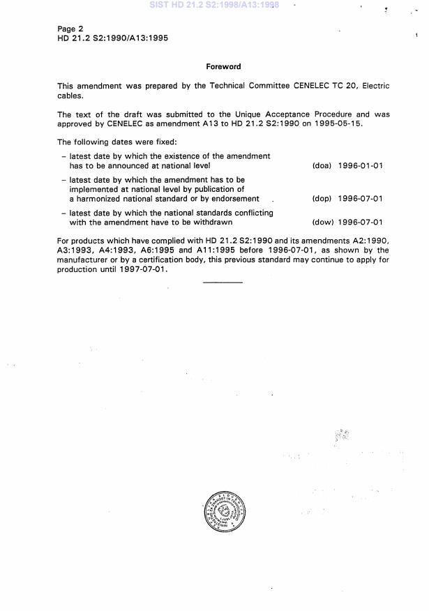 HD 21.2 S2:1990/A13:1995 is a amendment published by CLC. Its full title is "Polyvinyl chloride insulated cables of rated voltages up to and including 450/750 V - Part 2: Test methods". This standard covers: Certification period until 1997-07-01