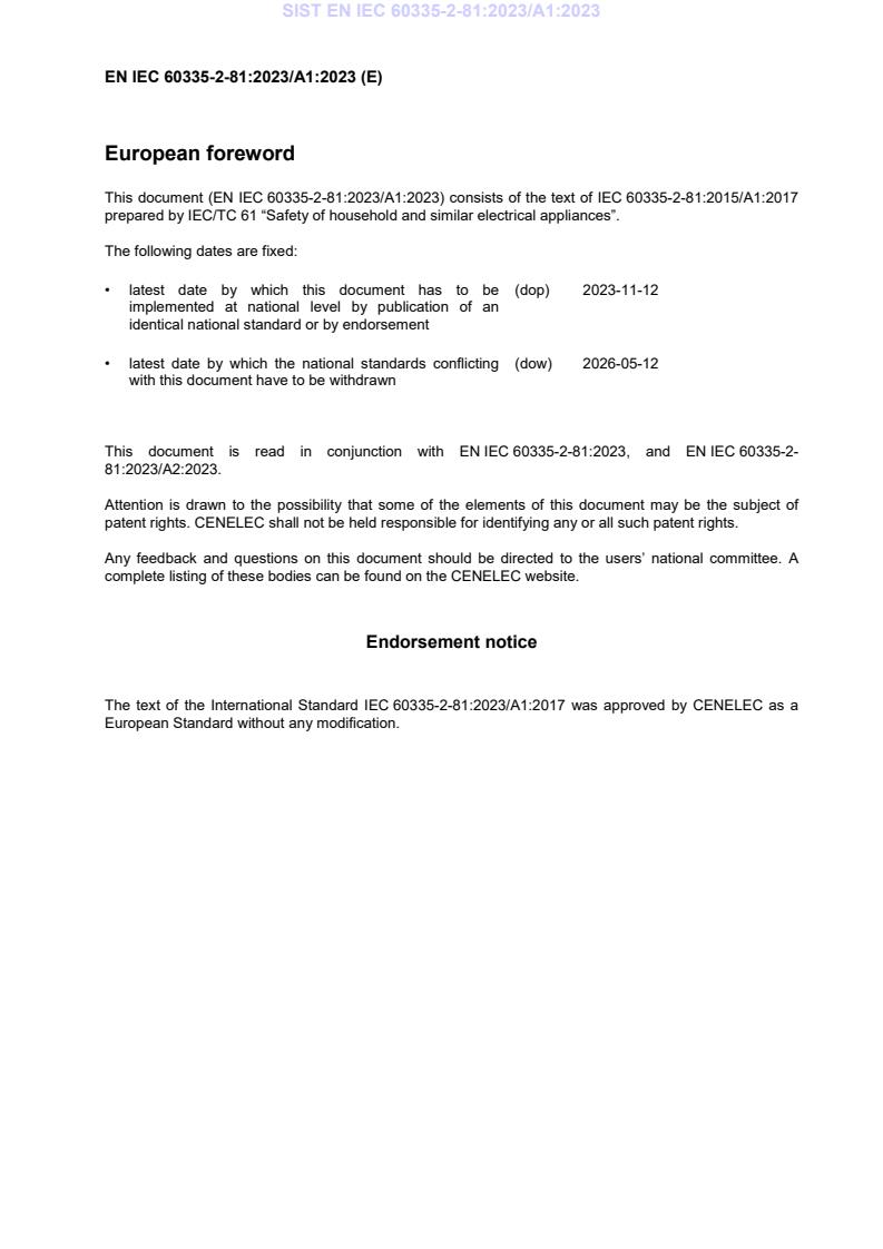 This amendment A1 modifies the European Standard EN IEC 60335-2-81:2023; it was approved by CENELEC on 2022-03-14. CENELEC