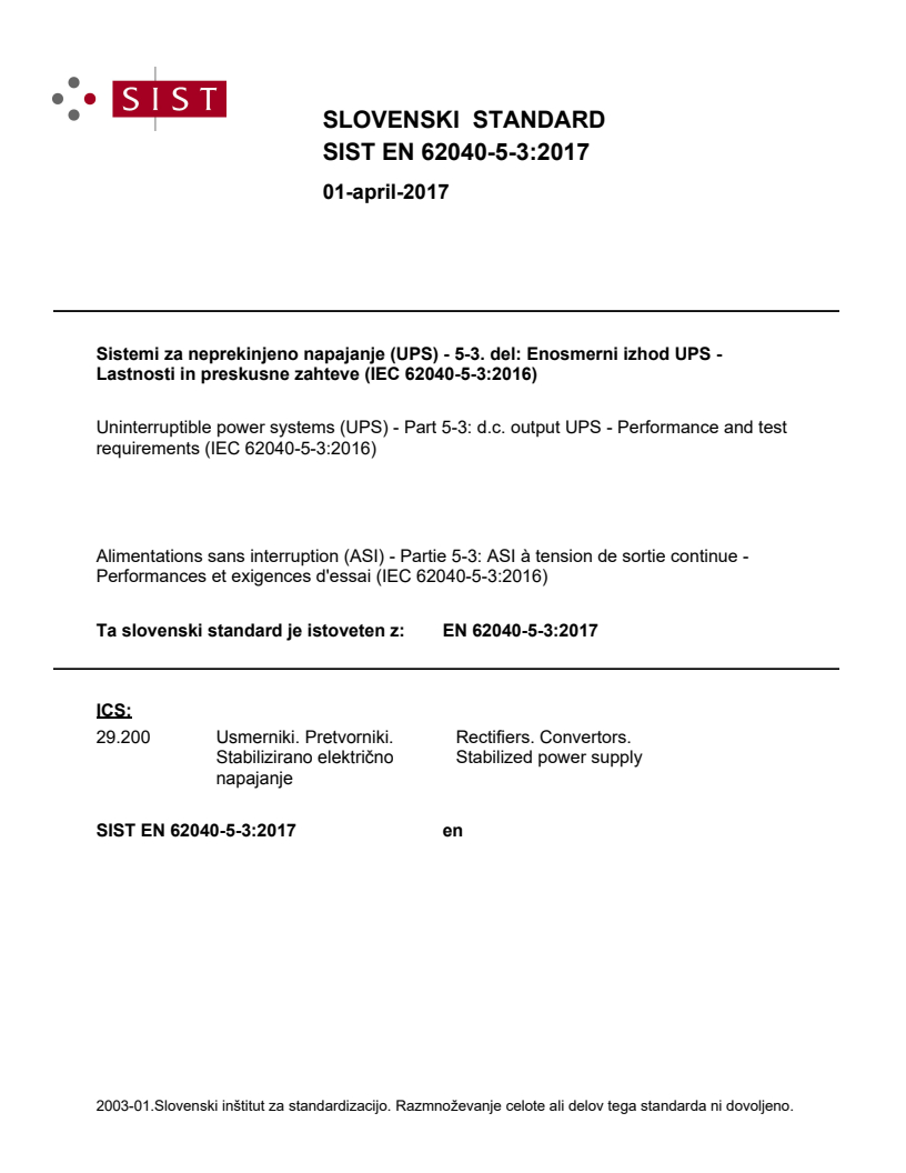 Ta slovenski standard je istoveten z: EN 62040-5-3:2017
