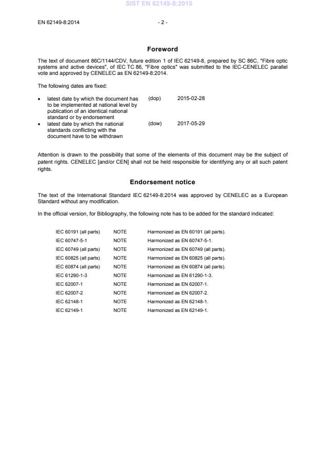 Attention is drawn to the possibility that some of the elements of this document may be the subject of patent rights. CENELEC [and/or CEN] shall not be held responsible for identifying any or all such patent rights. Endorsement notice The text of the International Standard IEC 62149-8:2014 was approved by CENELEC as a European Standard without any modification. In the official version, for Bibliography, the following note has to be added for the standard indicated: