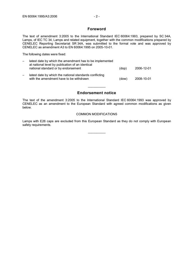 EN 60064:1995/A3:2006 is a CENELEC-adopted amendment to the European standard for tungsten filament (incandescent) lamps intended for domestic and similar general lighting purposes. It consolidates IEC 60064 (edition 6) with Amendment 3 (2005) and includes updated lamp data sheets, ILCOS coding information and common modifications required for European national adoption. (The extract does not include a full scope clause.)