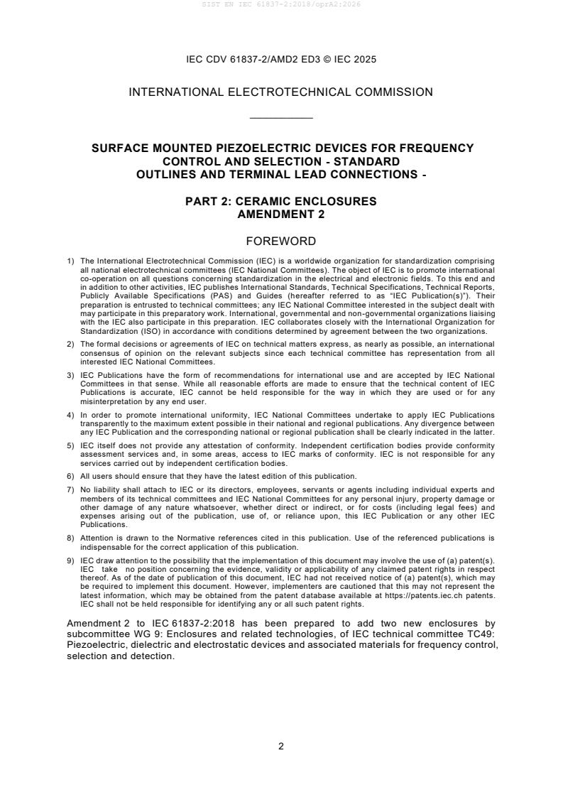 The EN IEC 61837-2:2018/prA2:2025 Amendment 2 is a critical update to the international standard governing surface mounted piezoelectric devices for frequency control and selection, specifically focusing on standard outlines and terminal lead connections for ceramic enclosures. This amendment is issued by the CLC (European Committee for Electrotechnical Standardization) and is maintained under the technical supervision of IEC Technical Committee 49 (TC49), which specializes in piezoelectric, dielectric, and electrostatic devices for frequency control, selection, and detection.