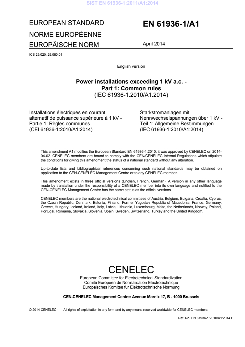 EN 61936-1:2010/A1:2014 is a standard – translation published by CLC. Its full title is "Power installations exceeding 1 kV a.c. - Part 1: Common rules". This standard covers: 2014-04-03: Publication allocated to tnaqvi@cencenelec.eu