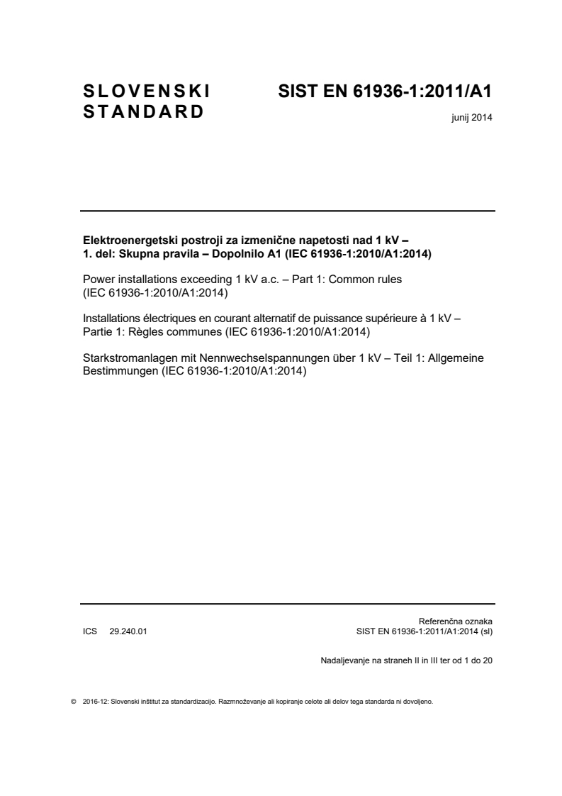 1. del: Skupna pravila – Dopolnilo A1 (IEC 61936-1:2010/A1:2014), 2014, ima status slovenskega