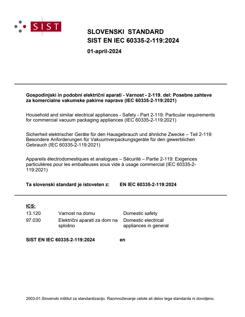 EN IEC 60335-2-119:2024 - "Household and similar electrical appliances - Safety - Part 2-119: Particular requirements for commercial vacuum packaging appliances" is the European adoption of IEC 60335-2-119:2021. The standard covers the safety requirements for commercial electric vacuum packaging appliances used for food preservation. It applies to appliances with rated voltages up to 250 V for single‑phase equipment and 480 V for other appliances, and is intended to be used together with IEC 60335-1 (Part 1).