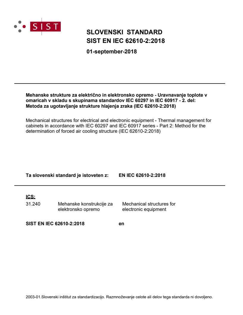 Mehanske strukture za električno in elektronsko opremo - Uravnavanje toplote v omaricah v skladu s skupinama standardov IEC 60297 in IEC 60917 - 2. del: Metoda za ugotavljanje strukture hlajenja zraka (IEC 62610-2:2018)