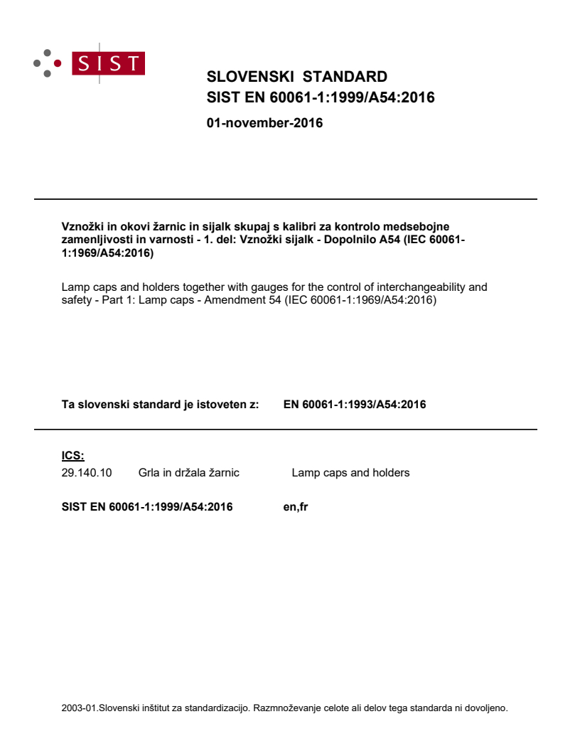 Ta slovenski standard je istoveten z: EN 60061-1:1993/A54:2016
